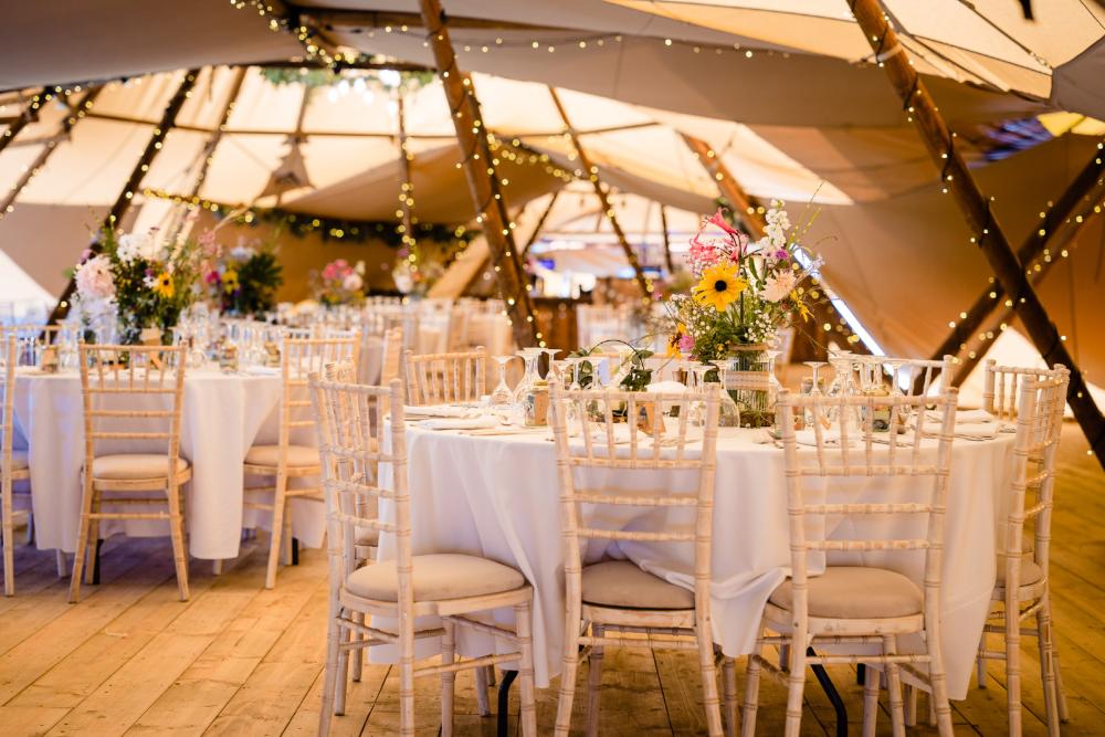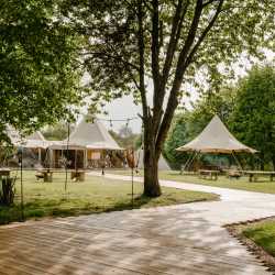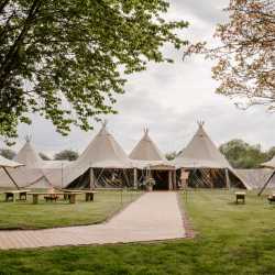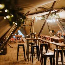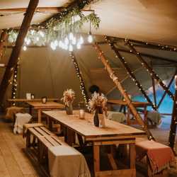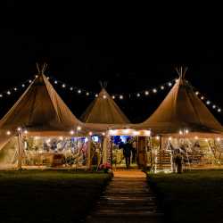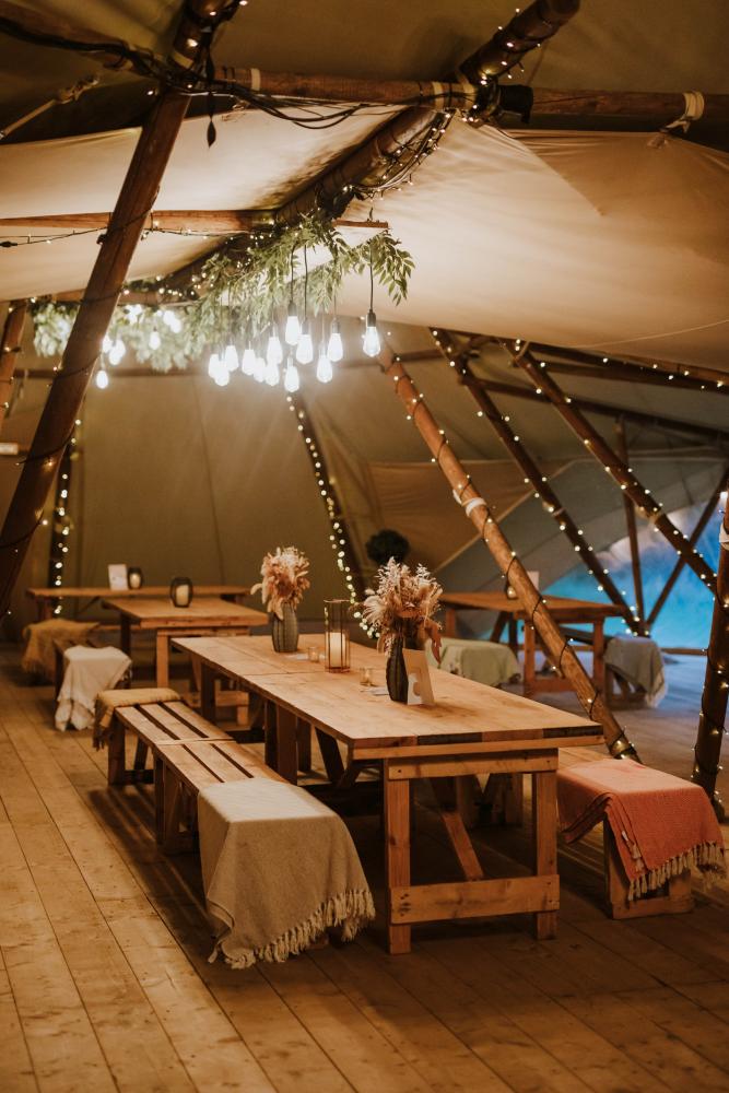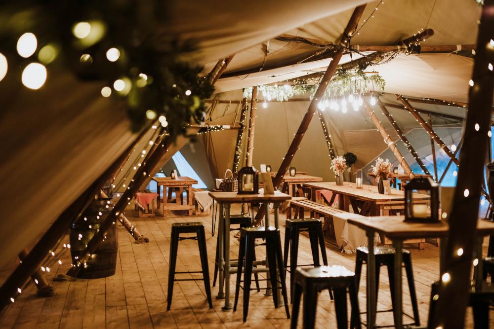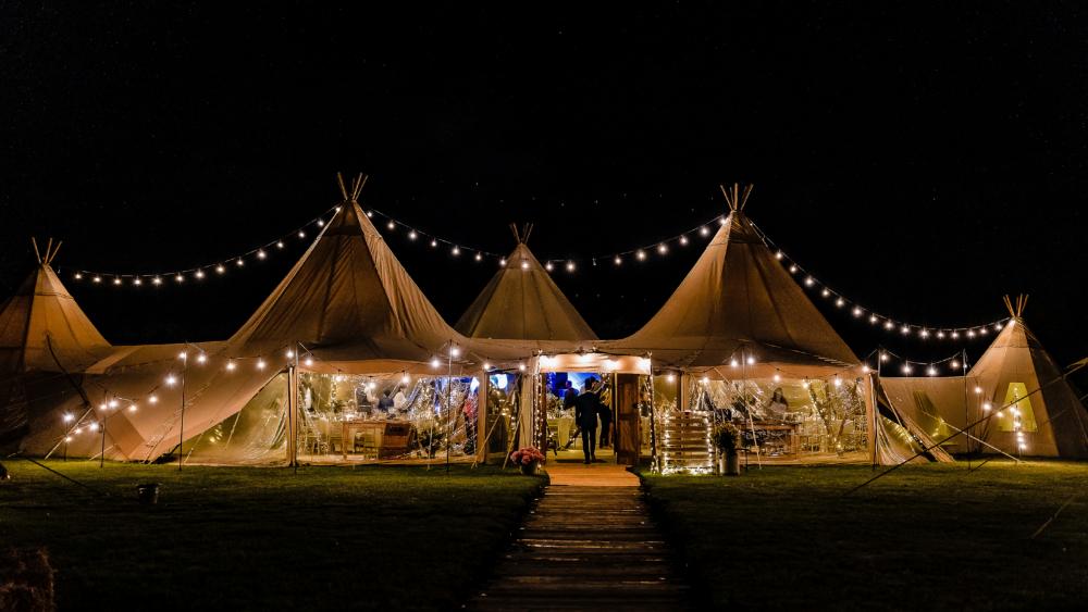 Dovecote Events' very own giant tipi makes the most inspired setting where you really can create an event like no other. Being one of only a small amount in the country, our exclusive tipi can accommodate either 120 for a formally seated event or up to 200 for something a little more relaxed. Complete with a wooden walkway, wooden flooring throughout, oak doors, outside shelters, fire pits, a bar, toilets, a chillout room, beautiful views and sprinkled with magical lighting inside and out, your tipi event will be something you and your guests will never forget.